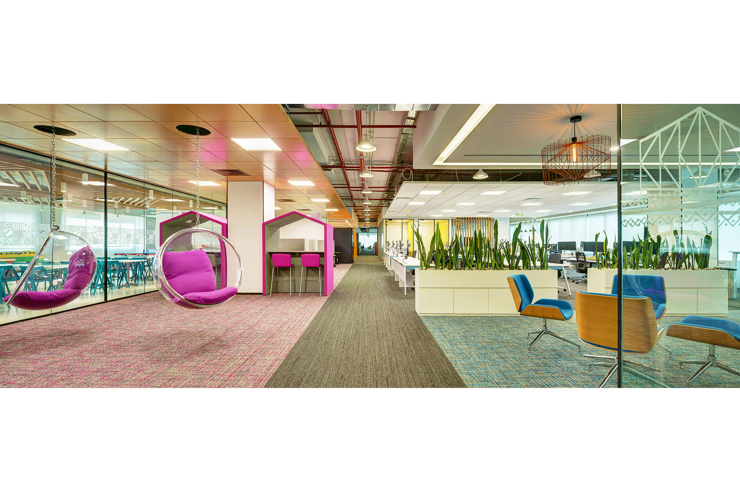 Collaboration zones include swings, tiered seating, and lounges that invite interaction and play. Greenery and natural textures run through the office, bringing life and calm to the floor.